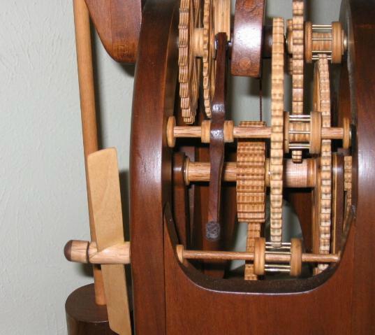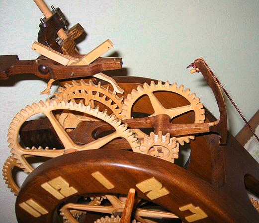 A side view, showing the gearing, the lantern pinions, and part of the nice walnut case. You can also see the fly fan remontoire governor.