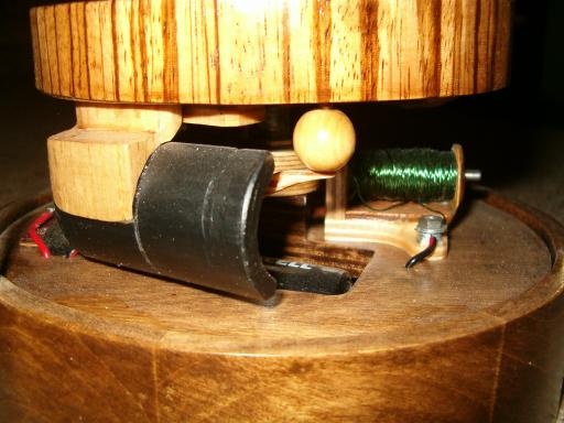 I wound my own electromagnet (middle photo). The actual switch (bottom photo) is the hair-trigger receiver switch from an old telephone. the Wooden Electric